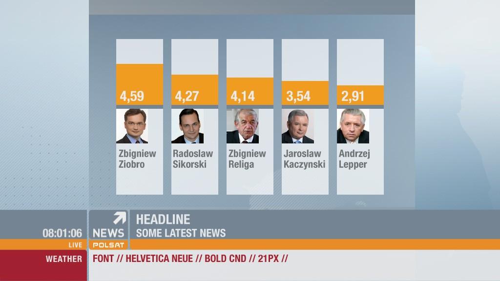 Während der Produktion von Wydarzenia wurden wir von Polsat gefragt, ob wir auch den neu zu startenden Nachrichtensender „Polsat News“ gestalten möchten. Wir haben natürlich zugesagt. Das Pfeil-Element von Wydarzenia wurde in die gesamte Polsat Logo-Design-Familie integriert. Die Affinität von Polsat News zu Wydarzenia war gewollt, da der Sender aus dem gleichen Studio-Set senden sollte und zur gleichen Senderfamilie gehörte.